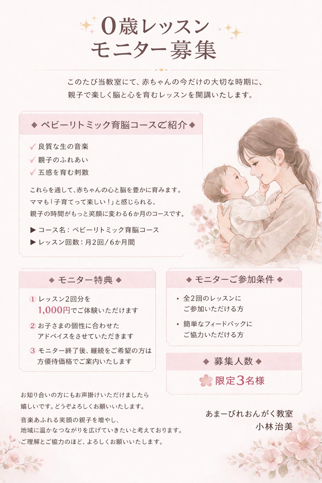 お知らせ この度、ベビー脳育のモニターを3名限定で募集をいたします! 音楽や五感を育む刺激、ふれあいを通じて赤ちゃんの心と脳を豊かに育むようなレッスンです。モニターは全2回!1,000円で体験していただくことができます。 ママもより一層子育てが楽しい!と感じられるような場になりますので、ぜひお気軽にご参加ください。 =======================参加条件〇全2回のレッスンにご参加いただける方〇簡単なフィードバックにご協力いただける方=======================